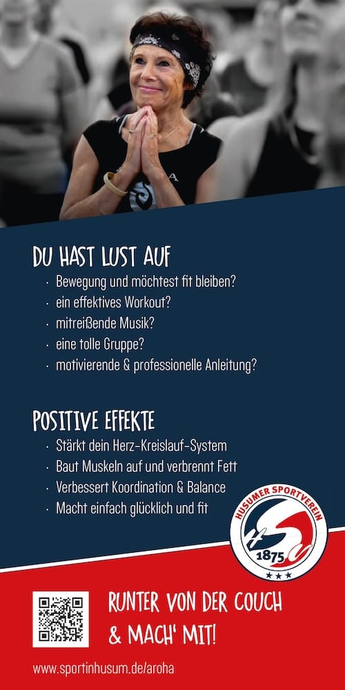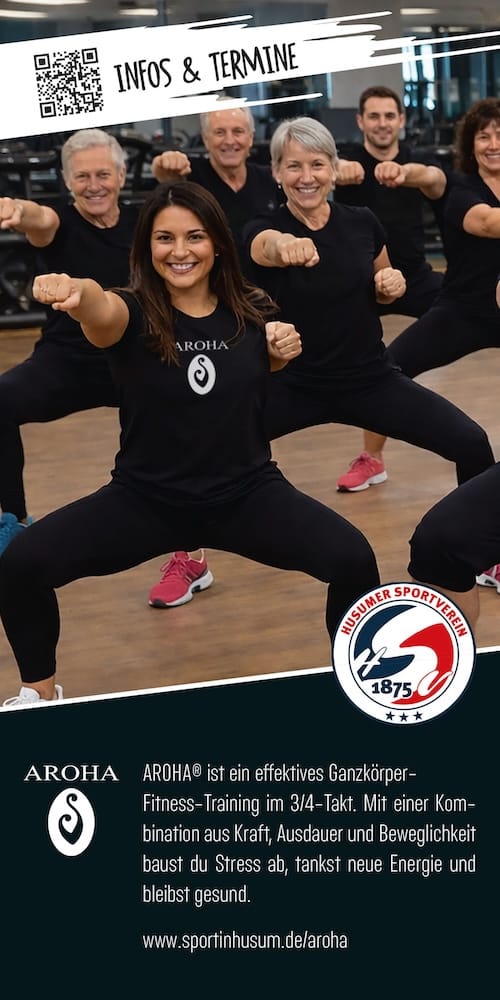 AROHA© ist ein effektives Ganzkörper-Fitness-Training im 3/4-Takt. Mit einer Kombination aus Kraft, Ausdauer und Beweglichkeit baust du Stress ab, tankst neue Energie und bleibst gesund.